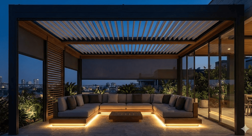 Automated Louvers: Sensors that automatically close the roof blades when rain is detected and open them to regulate sunlight.